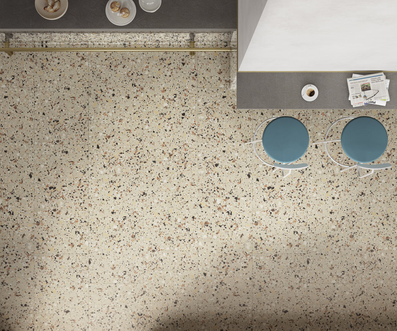 大きめのチップが練りこまれたテラゾー調タイル。柄が中まで通っているため巾木や出隅加工にも対応可能です。 ■環境配慮品 ・グリーンガード取得 ・LEED®評価寄与商品(原料リサイクル率:40%以上) ・EPD宣言商品