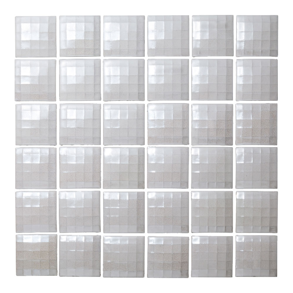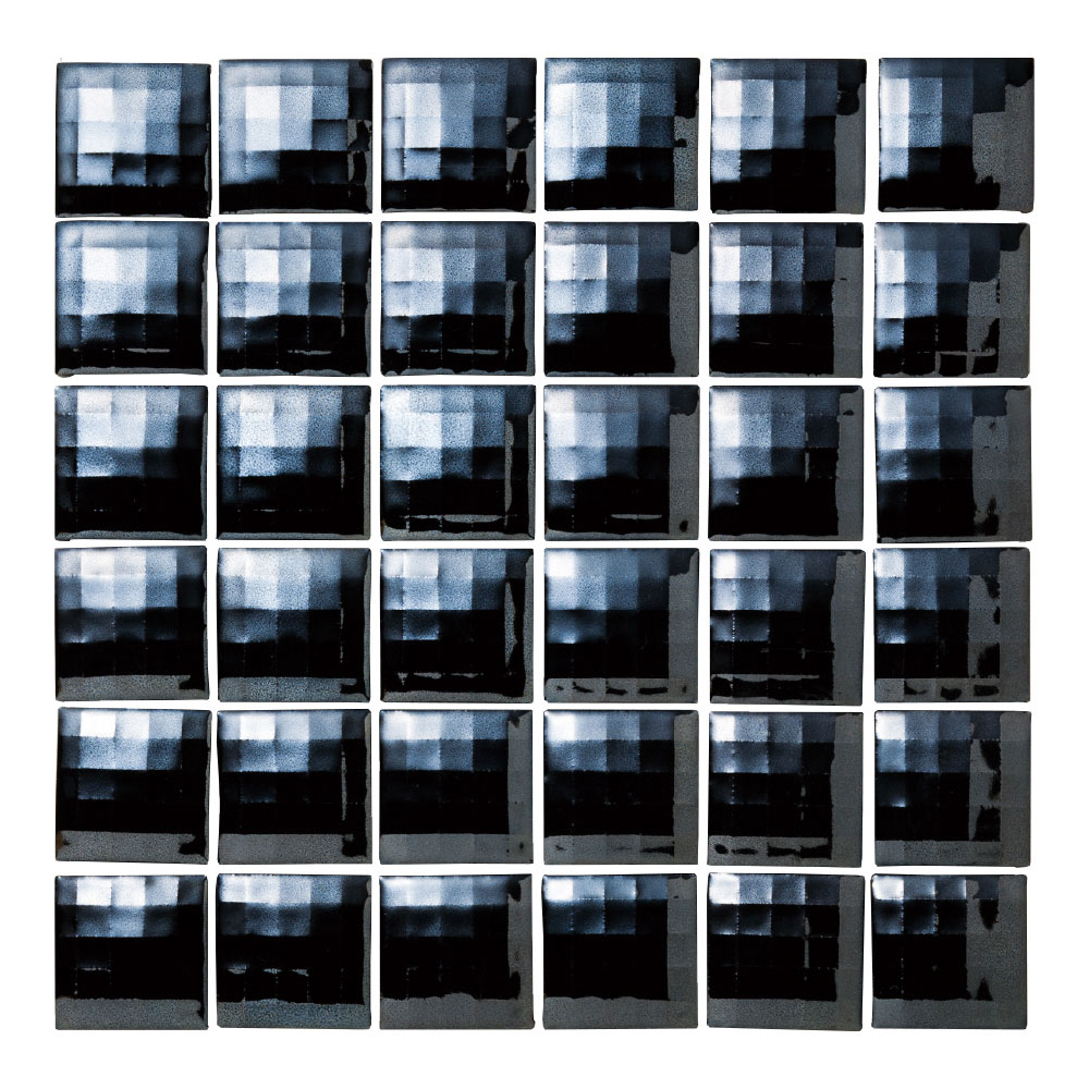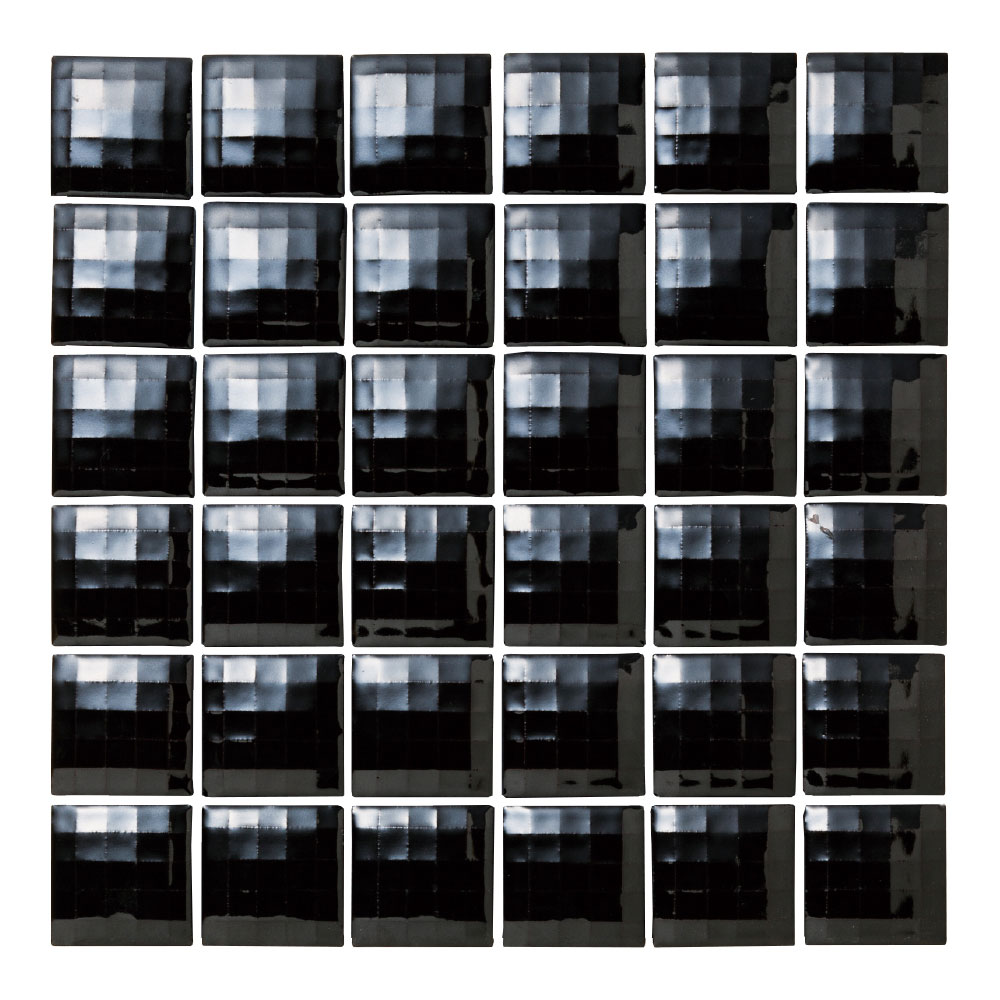 モダンな白黒のブライトとラスター釉のモザイクタイル。見る角度によって表情は多彩。