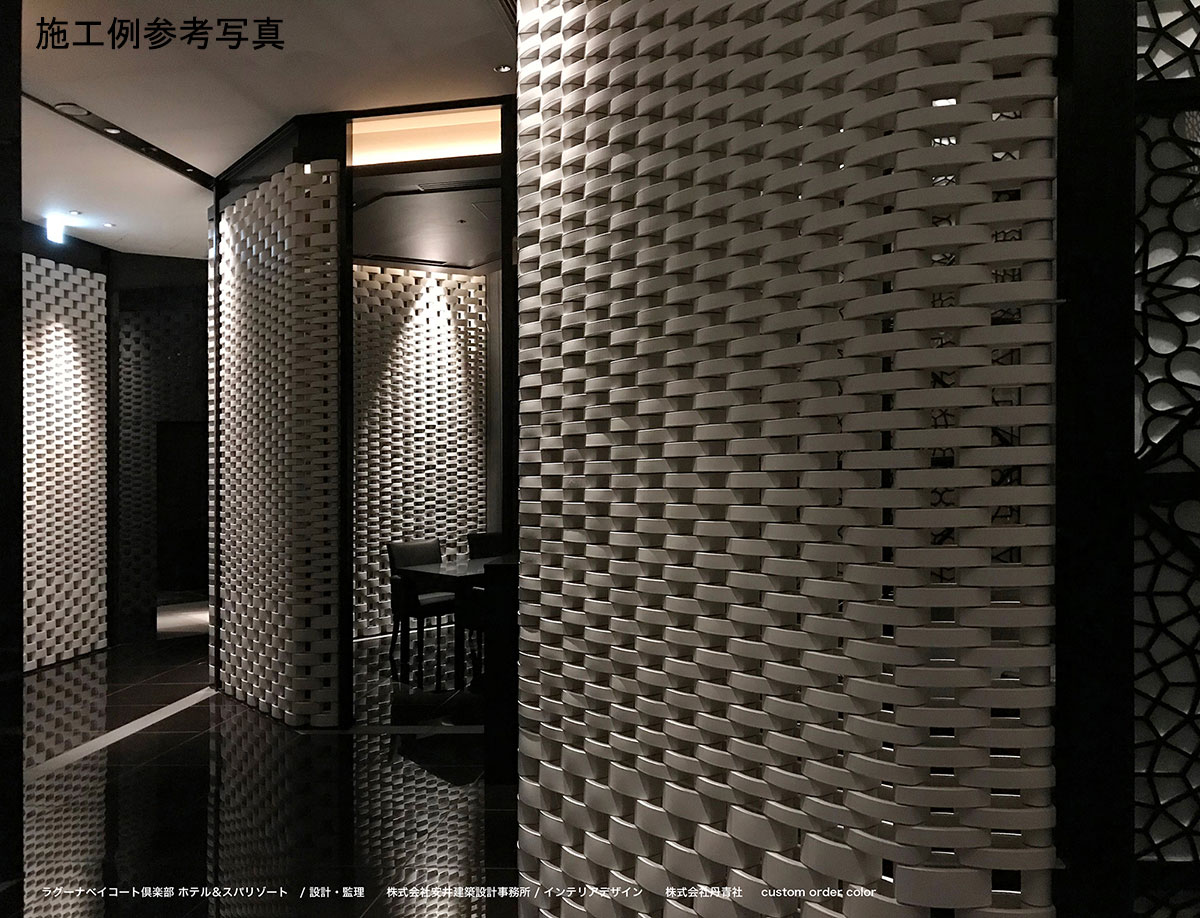 局面を持つユニークなフォルムのやきものを重ねながら積み上げる新しいタイプのスクリーン。 単一材料が数多く集まった面構成は空間を仕切る光の壁のようで美しく印象的。
