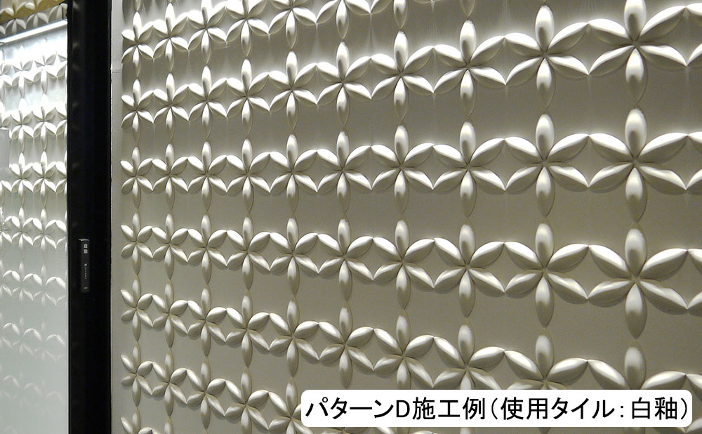 ふくらみをもったシンプルな花びらはクラシックにもモダンにも感じる。 着物の柄のようでありPOPな洋服のようでもある。 様々なパターンで表情色々。4パターン(A-D) ■施工パターン別 1㎡当たりの使用数 ・パターンA:251枚/m2: 0.95㎡/ケース ・パターンB:180枚/m2: 1.33㎡/ケース ・パターンC:176枚/m2: 1.36㎡/ケース ・パターンD:135枚/m2: 1.77㎡/ケース ※1㎡当たりの使用数は参考です。製品と製品の距離により使用数は異なります。