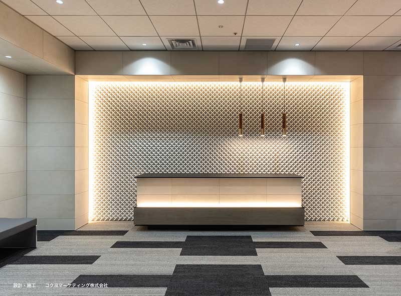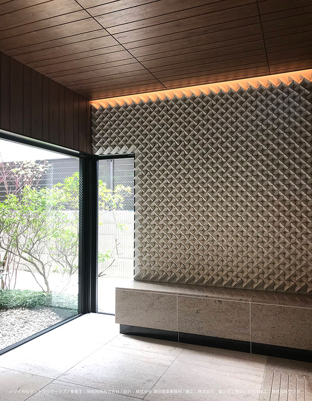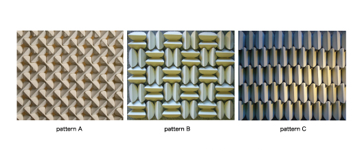 シンプルな立体は多様に変化する光の陰影を感じる。 ライティングによる演出が効果的なやきもの。立体タイル。 並べ方によっても印象が変わります。3パターンあり。 ■施工パターン別 ケース(150枚)入り1㎡当たりの使用数 ・パターンAで施工した場合:315枚/㎡ : 0.47㎡/ケース ・パターンBで施工した場合:306枚/㎡ : 0.49㎡/ケース ・パターンCで施工した場合:252枚/㎡ : 0.59㎡/ケース ※1㎡当たりの使用数は参考です。製品と製品の距離により使用数は異なります。