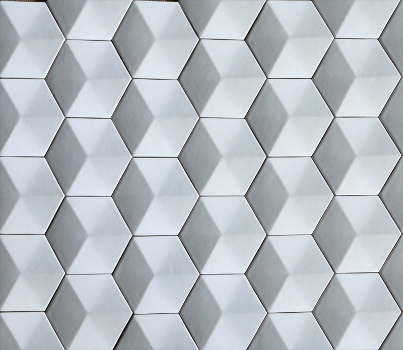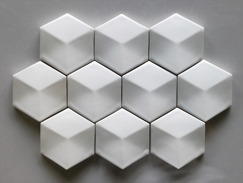 六角形(ヘキサゴンタイル)を遊ぶように、様々なパターンをデザインしたモデル。 凹凸による光の効果が視覚的なユニークさをつくります。 色は銀黒メタリック・アンティークゴールド・白土・白釉。
