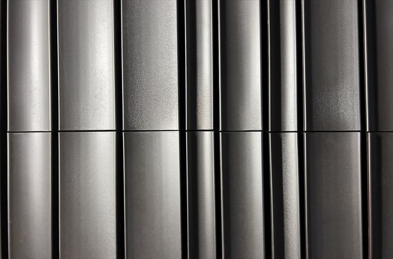 アールにくぼんだ少し長めのボーダータイル。 光を取り込むシンプルな連続性が美しい。 10mm程度の目地間隔がフォルムを際立たせる。 形状3種類 色はグレイッシュブラック・白釉 3種類の組み合わせにより様々なシンプルデザインが生まれる。