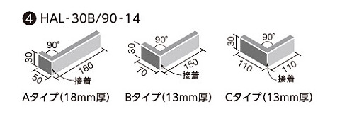 ●90°曲(接着)は3種類の形状を同梱しています。上下の役物タイルで縦目地が通らないように施工してください。