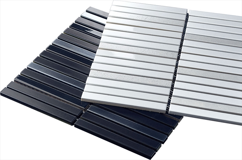 光沢感の異なるタイルを織り交ぜたシリーズです。スタイリッシュな印象のモノトーン系と和を感じさせる落ち着いた色合いのカラーミックス系のラインナップです。