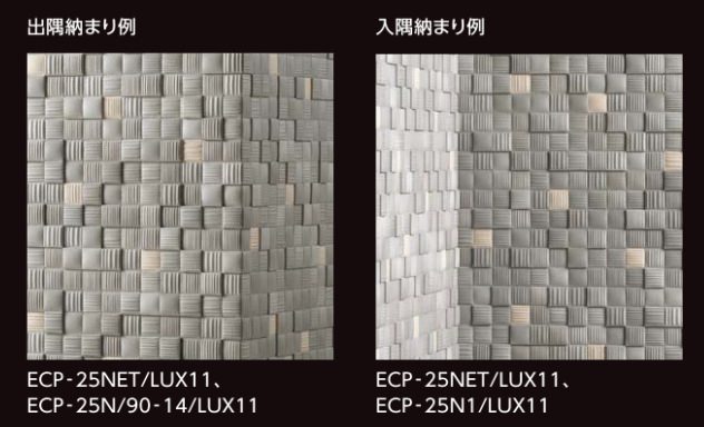 ●25角(納まり役物)は、入隅部分に同一厚さの粒をそろえることで、入隅の凹凸を軽減する役物ですが、意匠がついているため完全にフラットになるわけではありません。