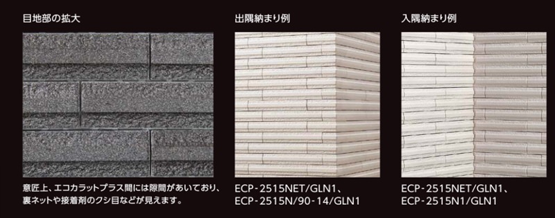 ●25×151角片面小端施釉(短辺)ネット張りは、入隅部分に同一厚さの粒をそろえることで、入隅の凹凸を軽減する役物ですが、意匠がついているため完全にフラットになるわけではありません。