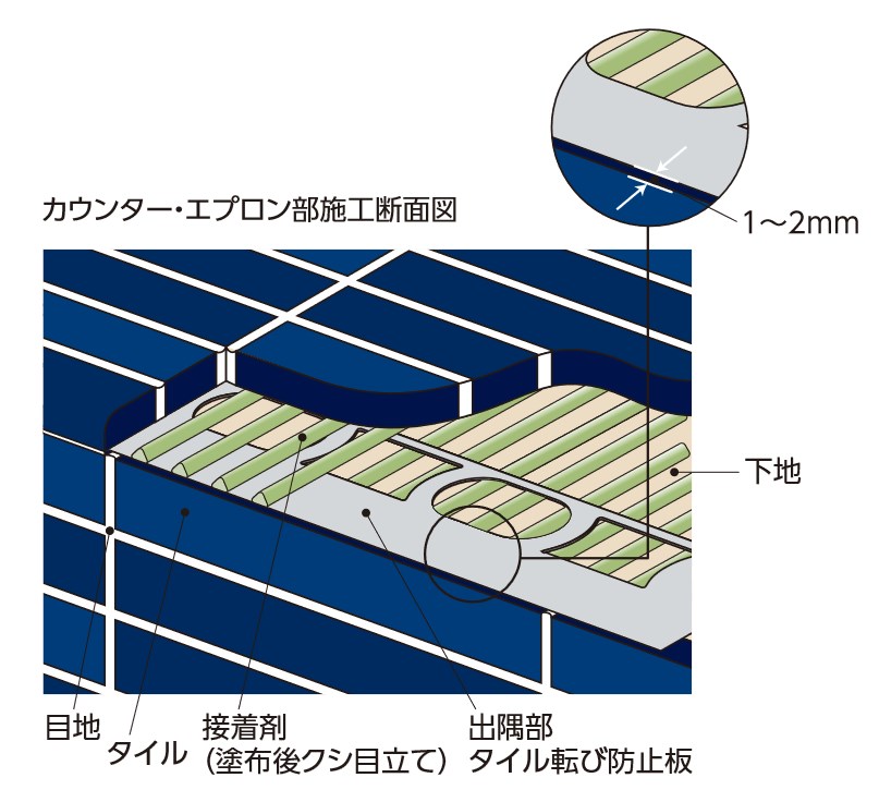 ●出隅部に片面小端施釉(長辺)をご使用の場合、出隅部タイル転び防止板をご使用ください。