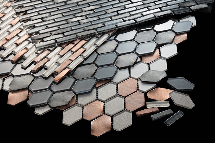 ヘアライン加工された金属とガラスという異なる光沢感を組み合わせたモザイクタイルです。 無骨でクールな印象に仕上がります。 8×32角のボーダー形状と、変形六角形(ヘキサゴンタイル)があります。
