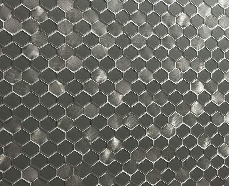 ヘアライン加工された金属とガラスという異なる光沢感を組み合わせたモザイクタイルです。 無骨でクールな印象に仕上がります。 8×32角のボーダー形状と、変形六角形(ヘキサゴンタイル)があります。