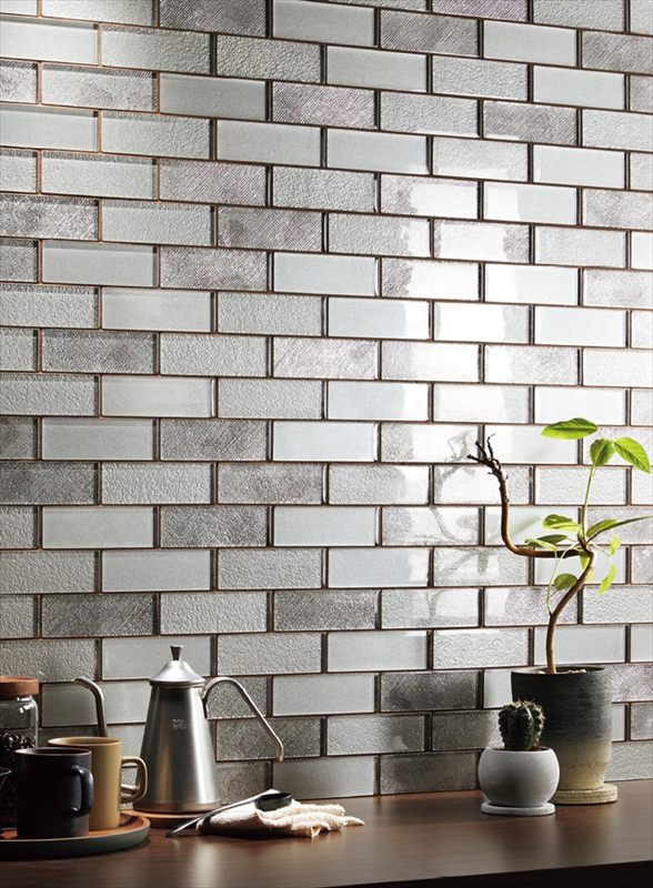 ●光を透過しやすい素材のため、目地・ネット・接着剤・下地の色等の影響で、施工前と施工後では色合いが違って見えることがあります。また、ガラスモザイクの側面や裏面の形状によって、部分的に暗い影が見えたり、明るく光ることがあります。
