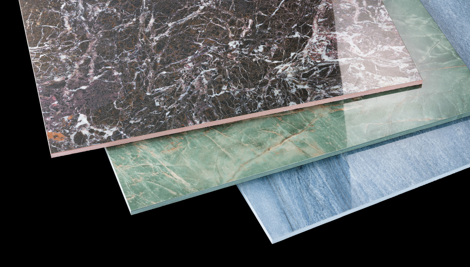 繊細なグラデーション、大胆な脈、個性あるカラーなど様々な希少石の特長を再現した磨きタイルです。モダンからゴージャスな空間づくりにお薦めです。