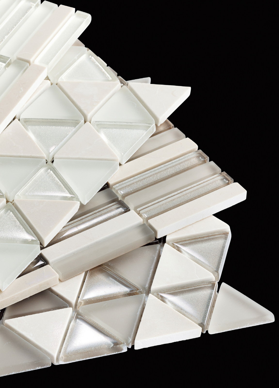 煌めくパールカラーのガラスと天然の大理石との組み合わせがとても上品です。三角形とボーダー形状を揃えたシリーズで、空間を華やかに演出します。