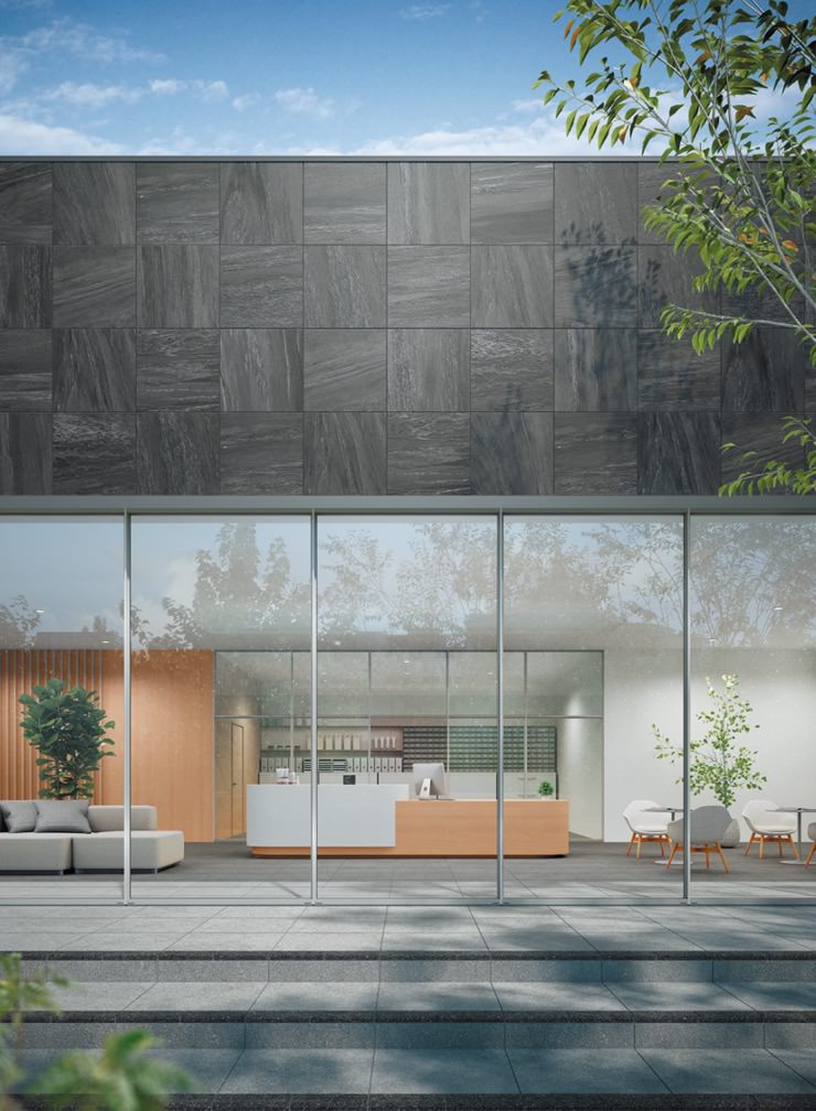 異なる大きさの粒状の表情が豊かな質感を表現するグラニット調内床・外壁、外床タイル。