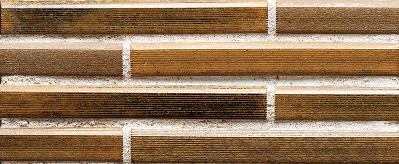 筋入り面状の平面と、変形の山形形状が特徴のボーダータイル。 組み合わせ次第でさまざまな陰影が楽しめ、存在感のある壁面を構成できます。