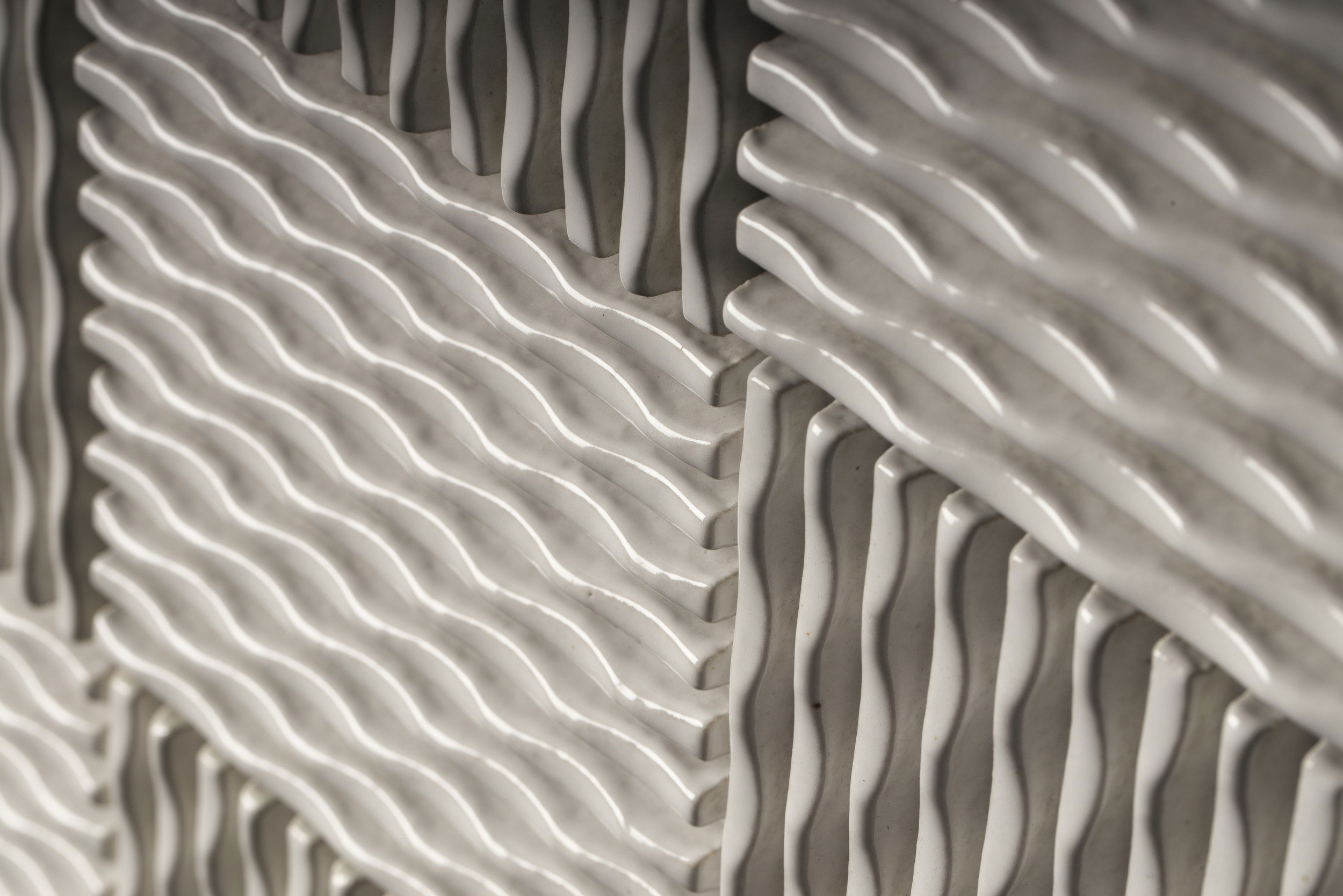 ストライプ上の凹凸とウェーブ面が、光と影のコントラストを美しく演出します。洗練されたデザインが空間に深みと動きを加えます。