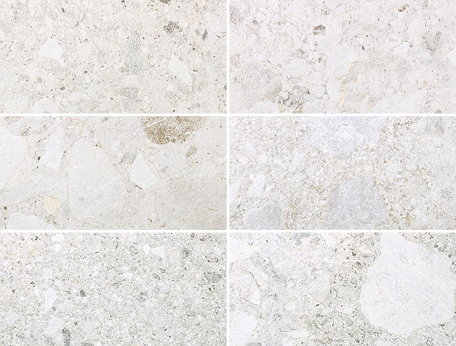 大小さまざまな石が混じっているのが特徴のイタリアの天然石・チェッポ ディ グレをモチーフにした天然石調タイルです。優しい色合いの中のランダムで美しい小石の粒模様がタイルの表情を豊かにします。