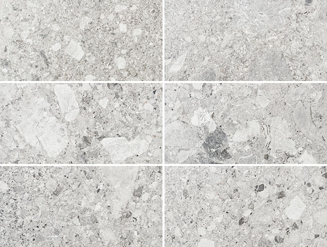 大小さまざまな石が混じっているのが特徴のイタリアの天然石・チェッポ ディ グレをモチーフにした天然石調タイルです。優しい色合いの中のランダムで美しい小石の粒模様がタイルの表情を豊かにします。
