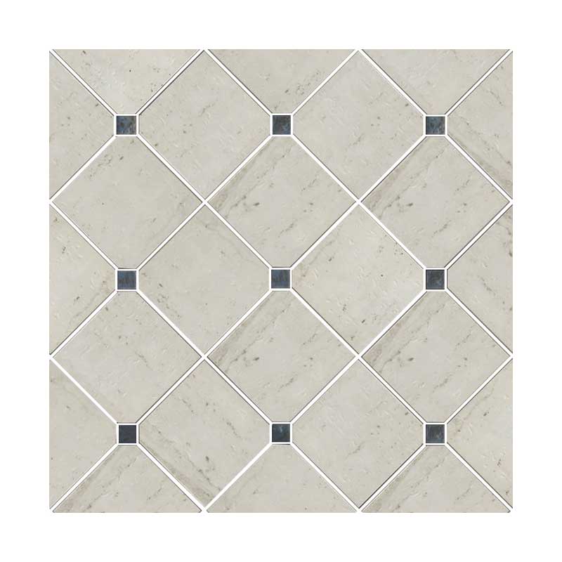 150角タイルの対角線上の二隅に23mm角タイルをドットとして用いたコンビネーションタイルです。 より広い床面・壁面に上質でクラシカルな雰囲気を醸し出します。