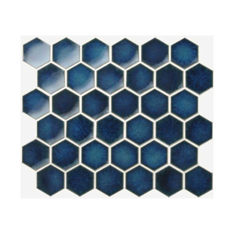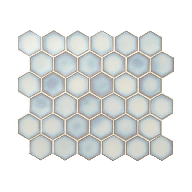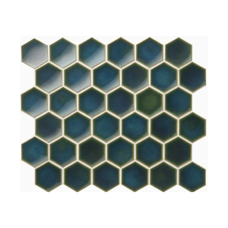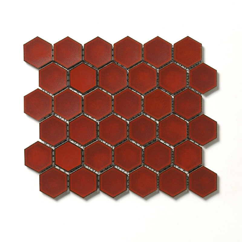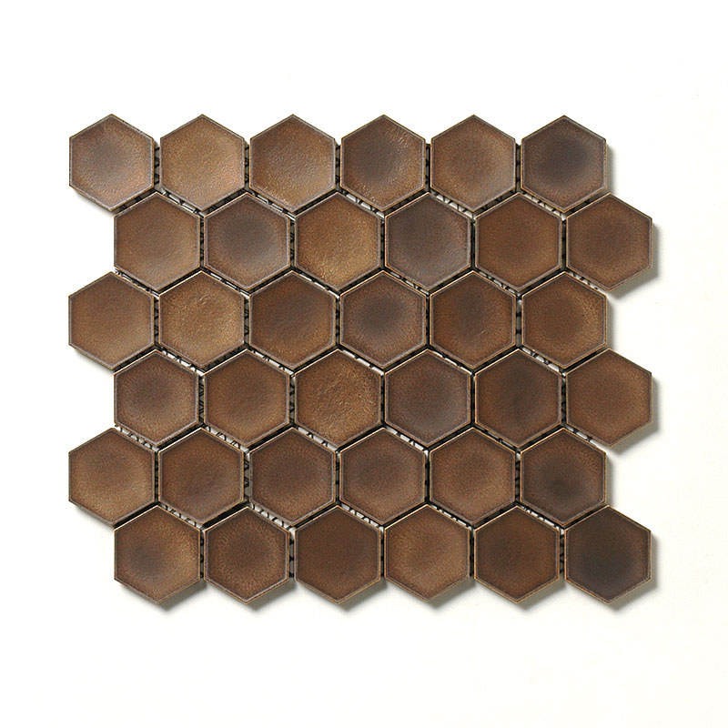 湾曲した凹面のヘキサゴンタイル(六角形)。 凹面による陰影と重厚な釉薬が品格のある雰囲気を作ります。