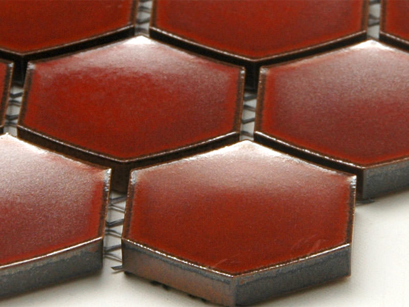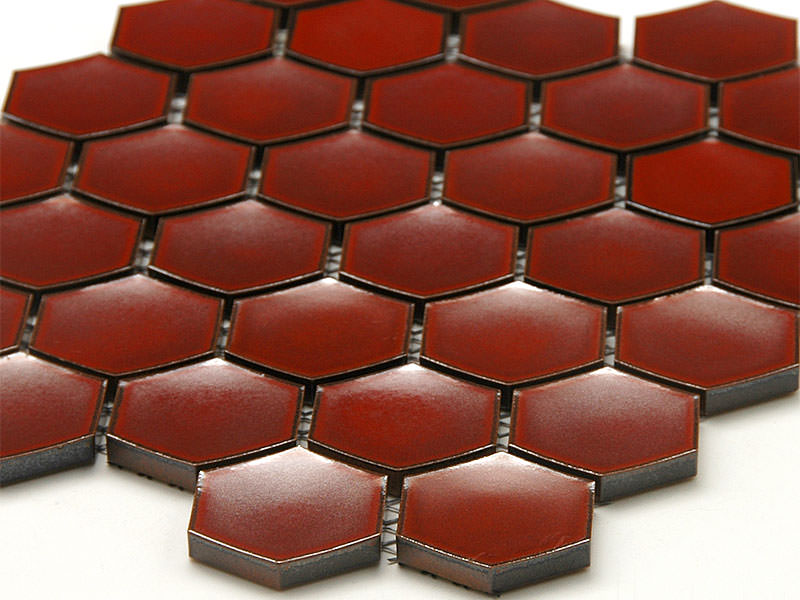 湾曲した凹面のヘキサゴンタイル(六角形)。 凹面による陰影と重厚な釉薬が品格のある雰囲気を作ります。