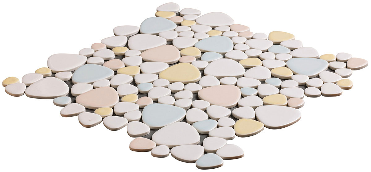レトロな雰囲気と現代的なデザインを融合させて上品で可愛らしい玉石モザイクタイル。滑らかな丸みが、空間に温かみを添えてます。