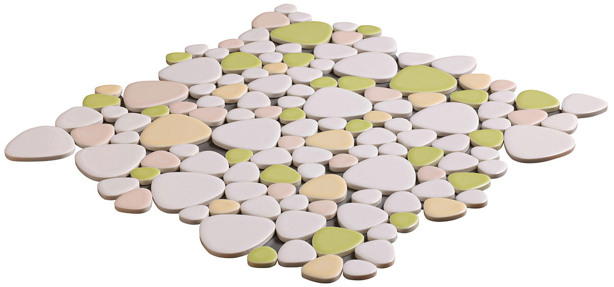 レトロな雰囲気と現代的なデザインを融合させて上品で可愛らしい玉石モザイクタイル。滑らかな丸みが、空間に温かみを添えてます。