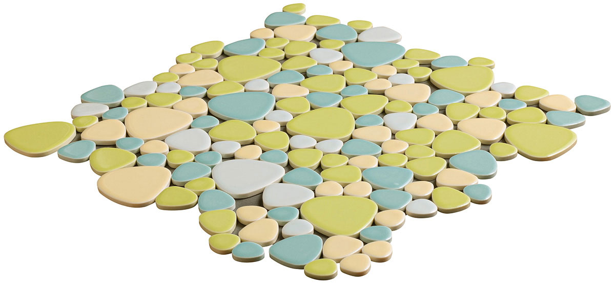 レトロな雰囲気と現代的なデザインを融合させて上品で可愛らしい玉石モザイクタイル。滑らかな丸みが、空間に温かみを添えてます。