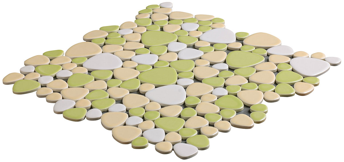 レトロな雰囲気と現代的なデザインを融合させて上品で可愛らしい玉石モザイクタイル。滑らかな丸みが、空間に温かみを添えてます。