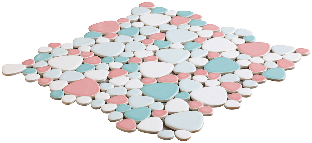 レトロな雰囲気と現代的なデザインを融合させて上品で可愛らしい玉石モザイクタイル。滑らかな丸みが、空間に温かみを添えてます。