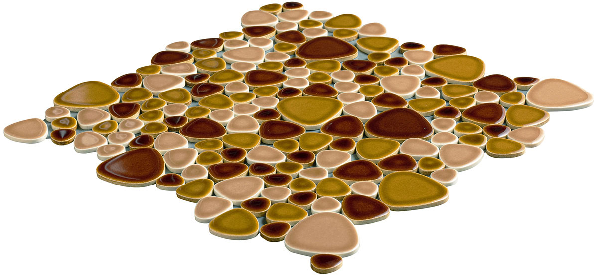 レトロな雰囲気と現代的なデザインを融合させて上品で可愛らしい玉石モザイクタイル。滑らかな丸みが、空間に温かみを添えてます。