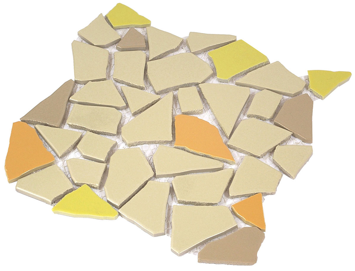 曲面・曲線に張ることができるタイルです。生産工程で人間が割っていますので同じ形状はありません。鋭角部分の縁も丸く加工しているので安全です。