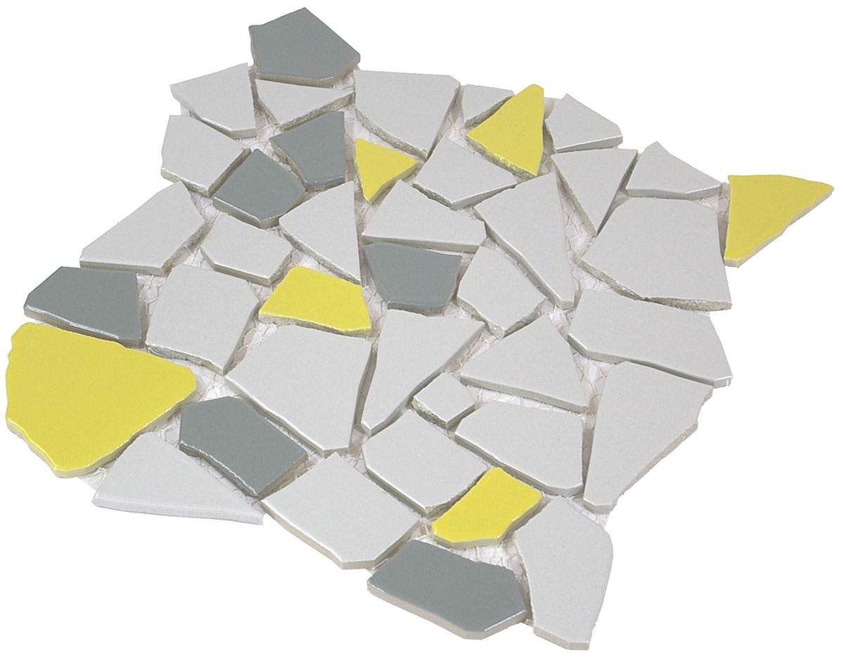 曲面・曲線に張ることができるタイルです。生産工程で人間が割っていますので同じ形状はありません。鋭角部分の縁も丸く加工しているので安全です。