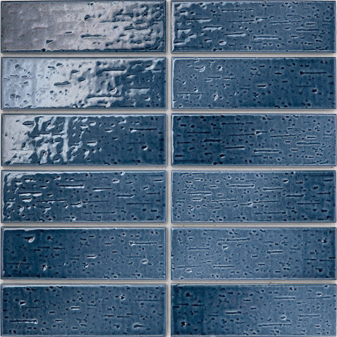 面状の凹凸を活かし、ハンドメイドの質感を演出したタイル。清涼感あるカラーは窯変調の色むらを強く出し、個性的な色合いが魅力です。