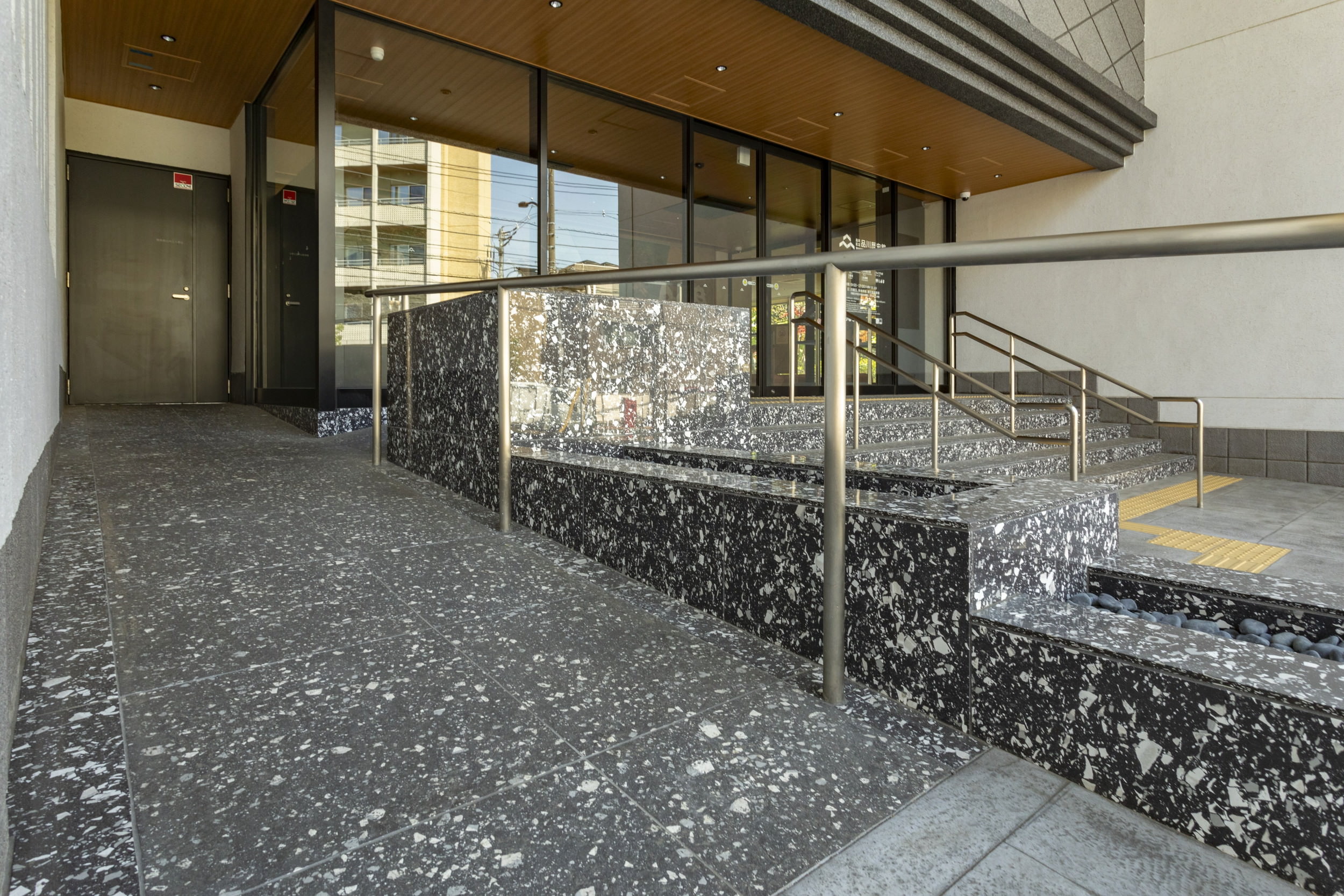 大きめのチップが練りこまれたテラゾー調タイル。柄が中まで通っているため巾木や出隅加工にも対応可能です。 ■環境配慮品 ・グリーンガード取得 ・LEED®評価寄与商品(原料リサイクル率:40%以上) ・EPD宣言商品