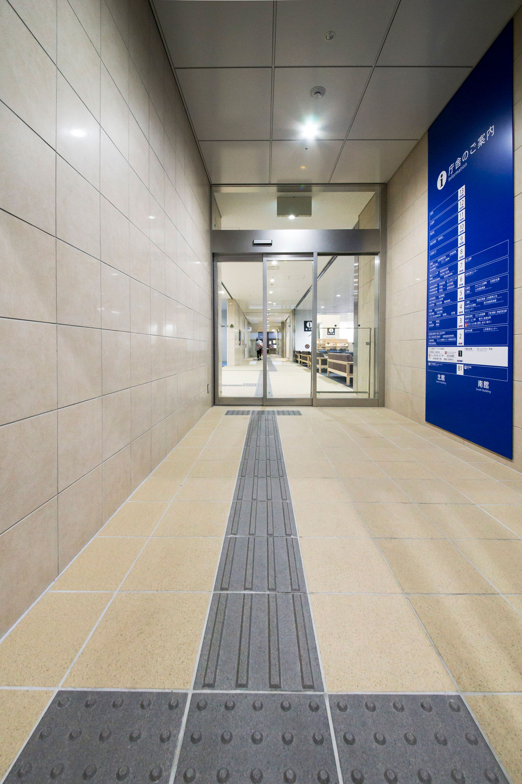●スロープ床タイルは車椅子での走行時にガタツキが少なく、高齢者のすり足歩行でもつまずきにくい突起部の高さを追求しました。凸凹がスムーズな歩行を支え、滑りにくい表面加工です。
