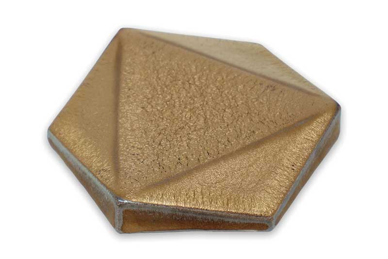 ベースとなる六角フォルムに補助線を加えることで生じるトライアングルパターンをデザインしたモデル。 やきものでありながらメタリックな印象を有する。 人気の六角タイル(ヘキサゴンタイル)と凹凸から生まれる陰影による表情の違いがお楽しみいただけます。 色は銀黒メタリック・アンティークゴールド。