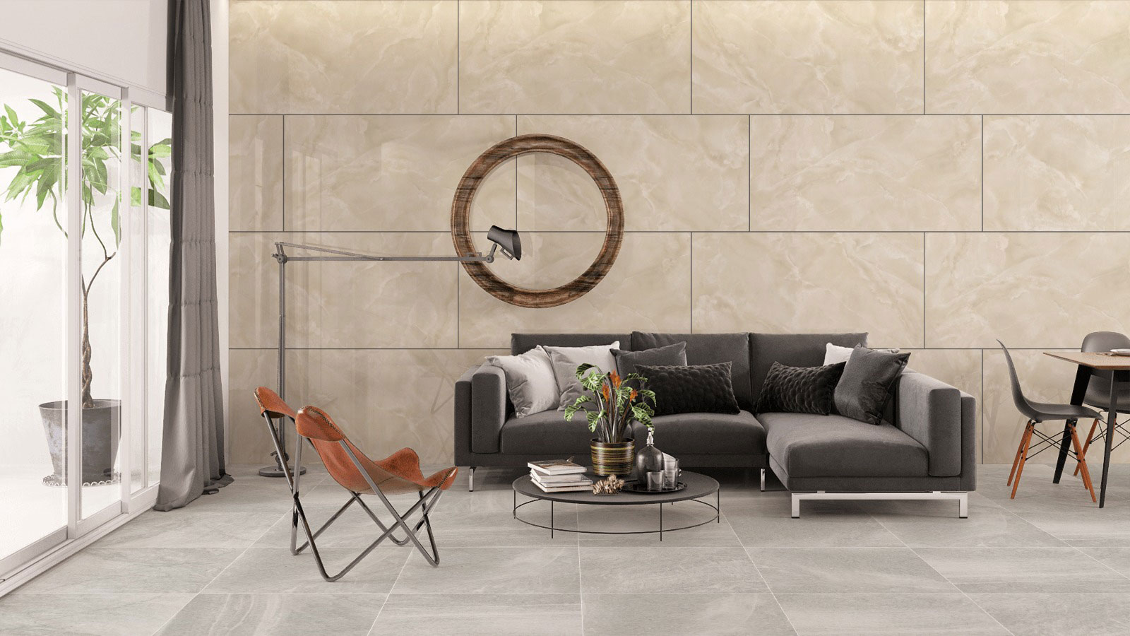 厚さ4.8㎜の薄型大判タイルです。大理石調の磨きタイルが高級感を演出します。