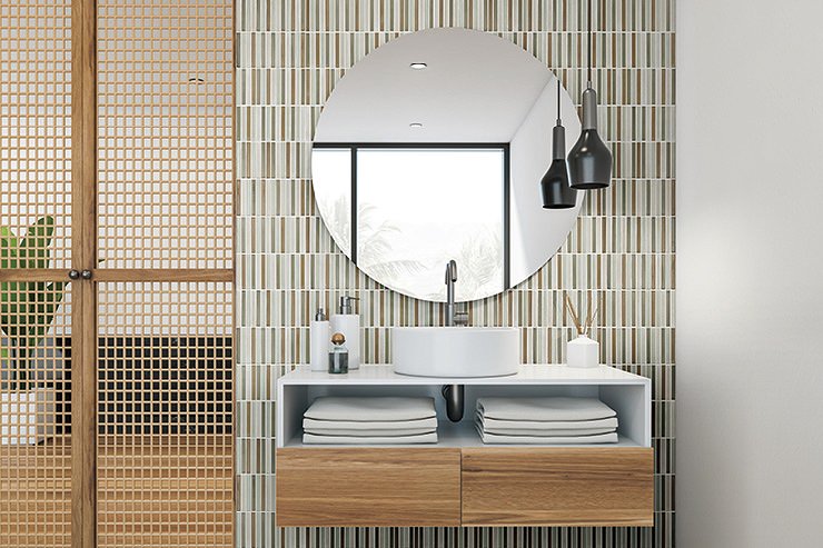 光沢感の異なるタイルを織り交ぜたシリーズです。スタイリッシュな印象のモノトーン系と和を感じさせる落ち着いた色合いのカラーミックス系のラインナップです。