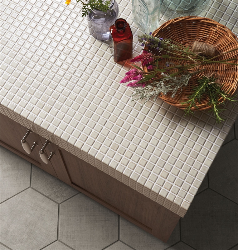 レトロな表情、色合いのタイルを混ぜ合わせました。 アンティーク感のある木調家具などになじみの良い色合いです。