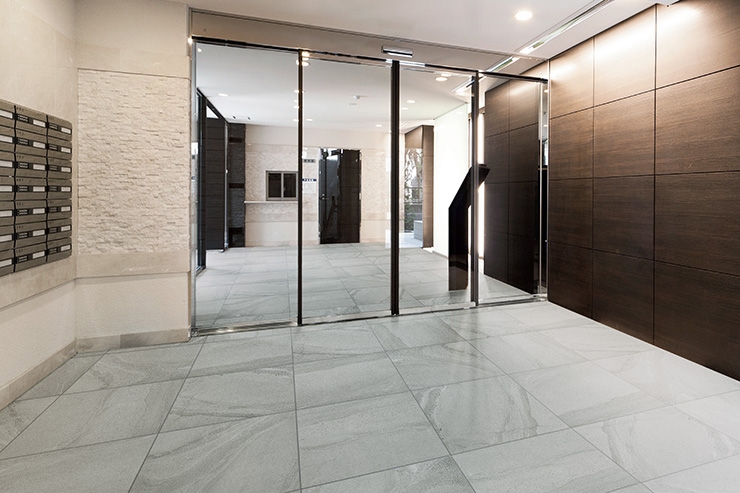 品位のあるライムストーンデザインが特長の大型内・外装床タイルです。 組み合わせることでエントランスからロビーまでを彩ります。