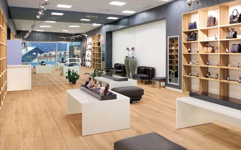 天然木の自然な色合いや流れるような木目を表現した内外床タイルです。 店舗床や住宅玄関におすすめです。