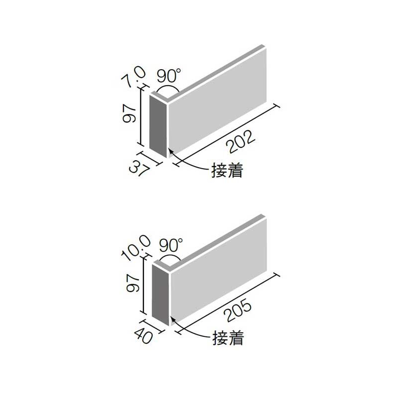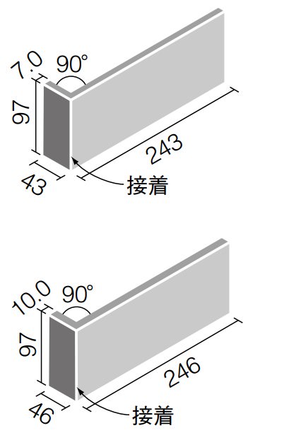 ●500×100mm角平と300×100㎜角平を張り合わせる場合は90°曲(接着)をご利用いただくと縦目地が揃いにくいです。