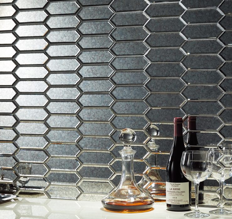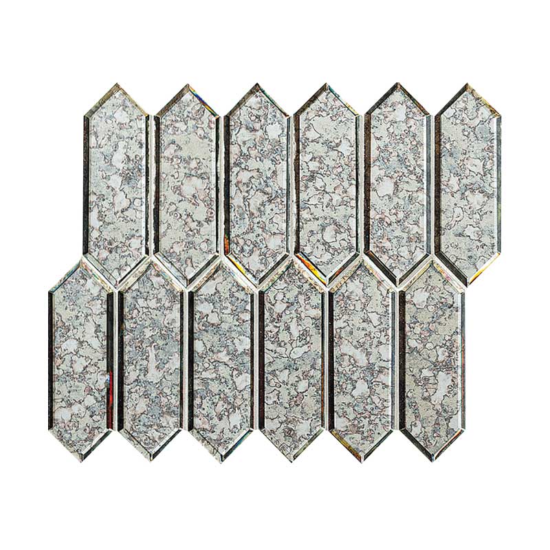 変形六角形状の大きめサイズのガラスモザイクです。ビンテージ調のミラーによる映り込みは空間に馴染みながら広がりを感じさせます。