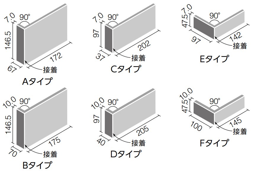●異形状90°曲セット(接着)は6種類の形状を同梱しています。上下の役物タイルで縦目地が通らないように施工してください。