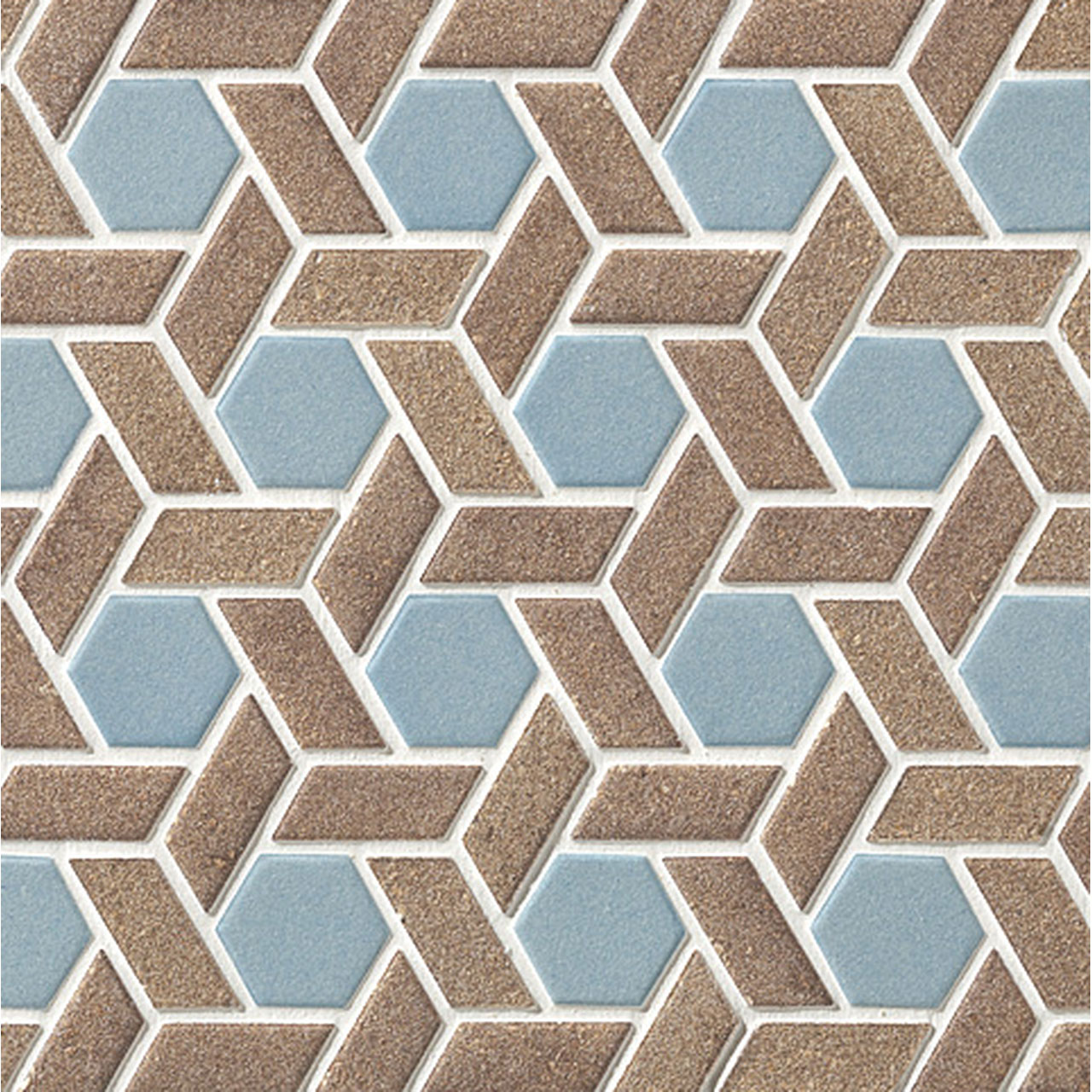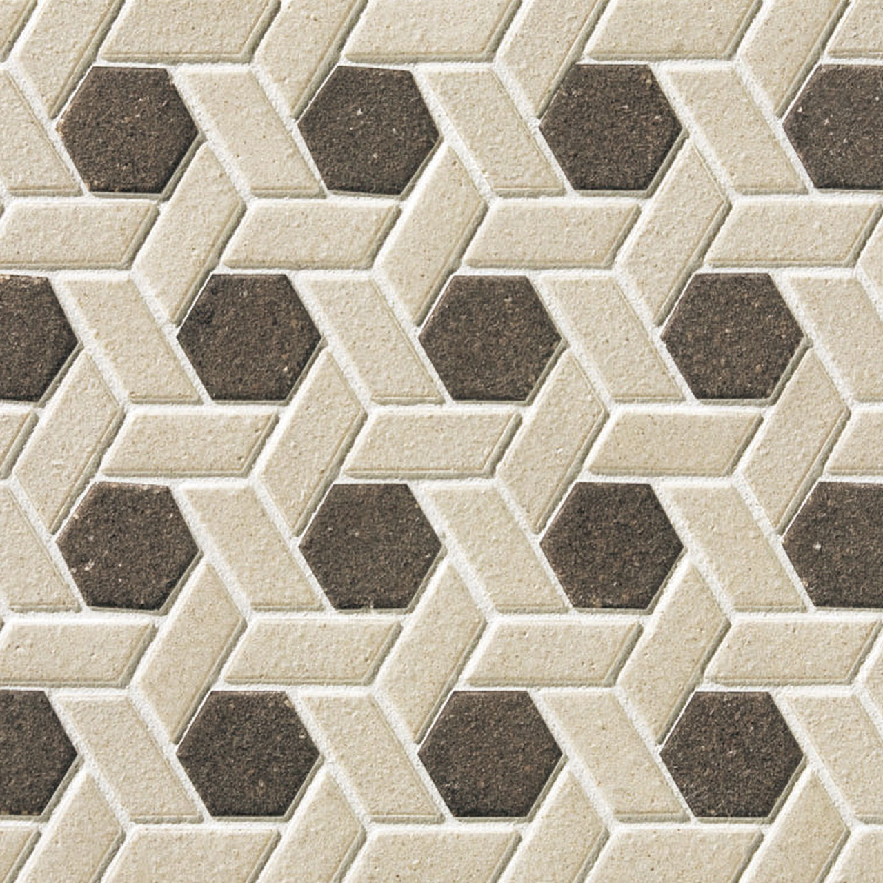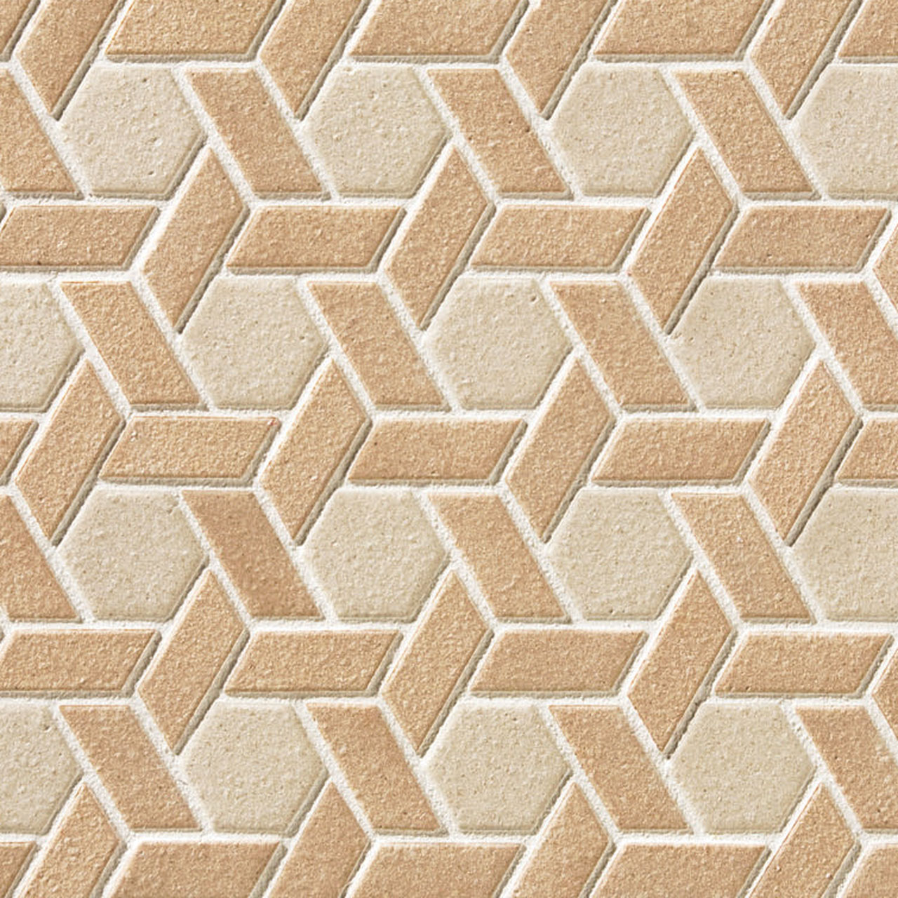 六角形と平行四辺形で組んだパターンが個性的なデザイン。アースカラーのモザイクタイルはナチュラルで優しいイメージです。