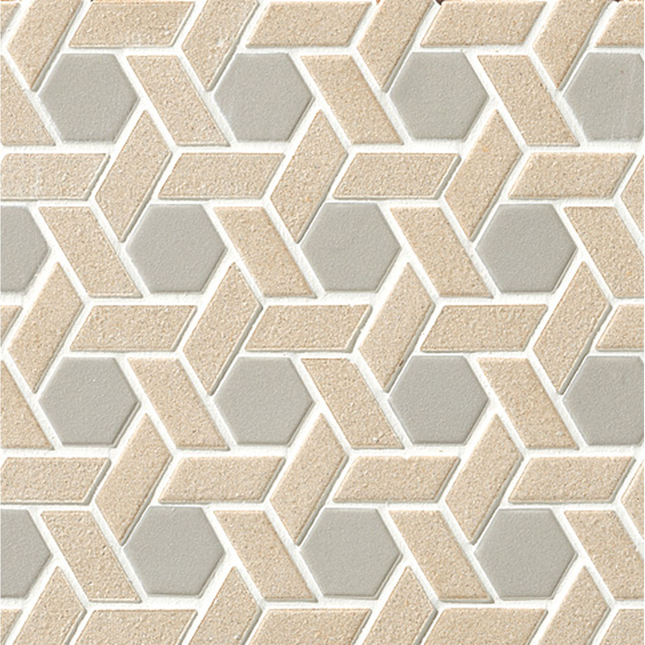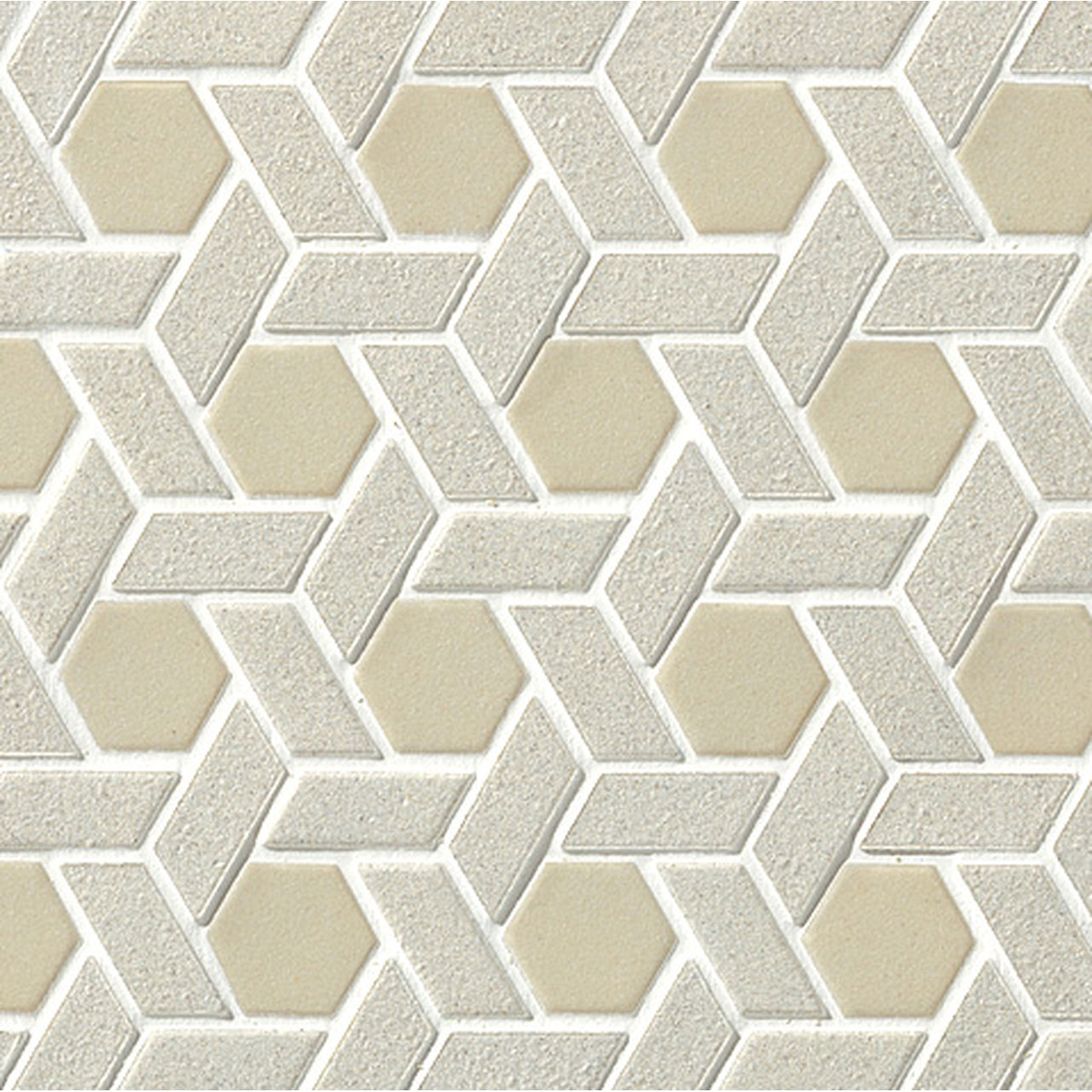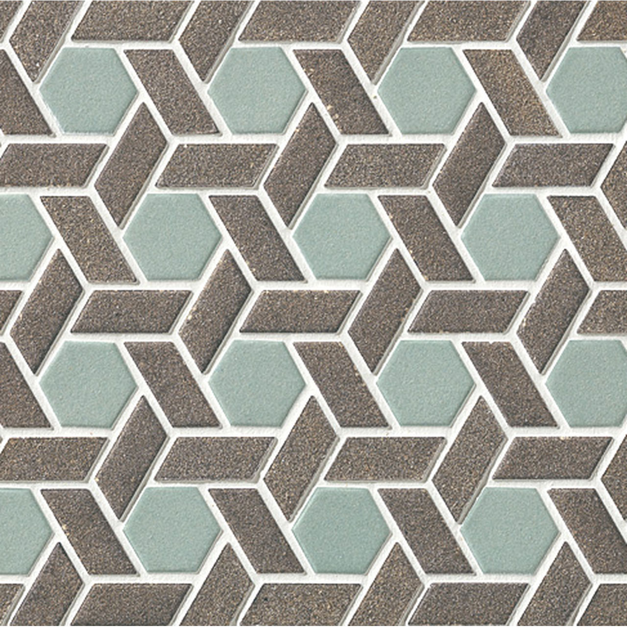 六角形と平行四辺形で組んだパターンが個性的なデザイン。アースカラーのモザイクタイルはナチュラルで優しいイメージです。