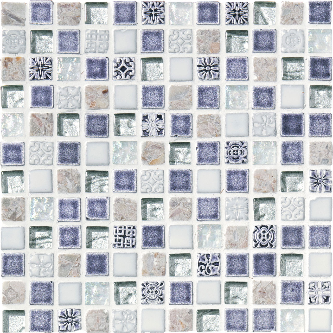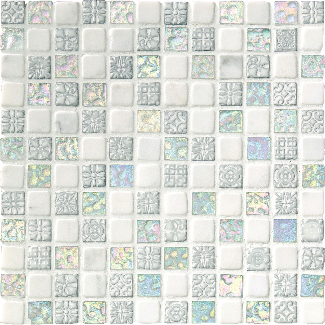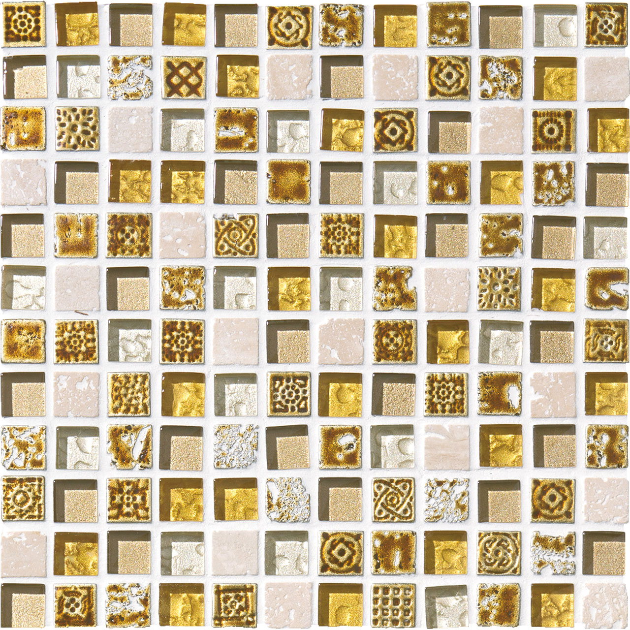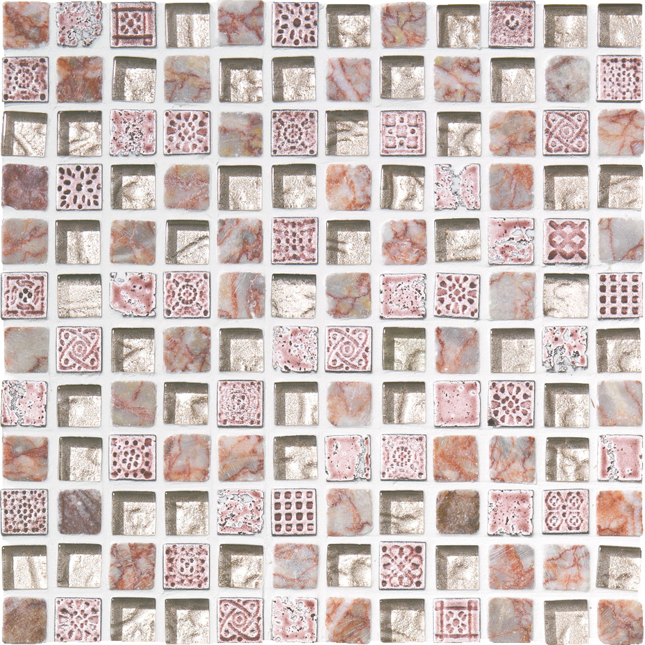 宝石をミックスして敷き並べたパヴェジュエルのようなモザイク。大理石やガラス、磁器などの多素材が混ざり合った美しいタイルです。