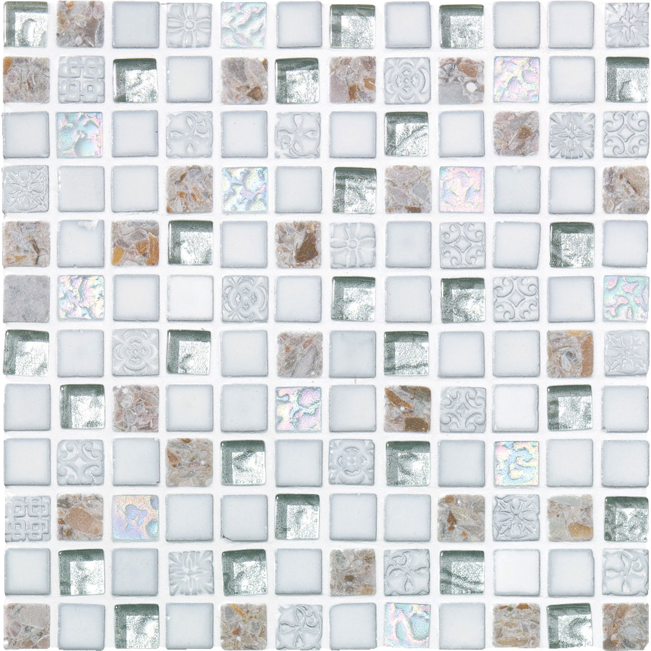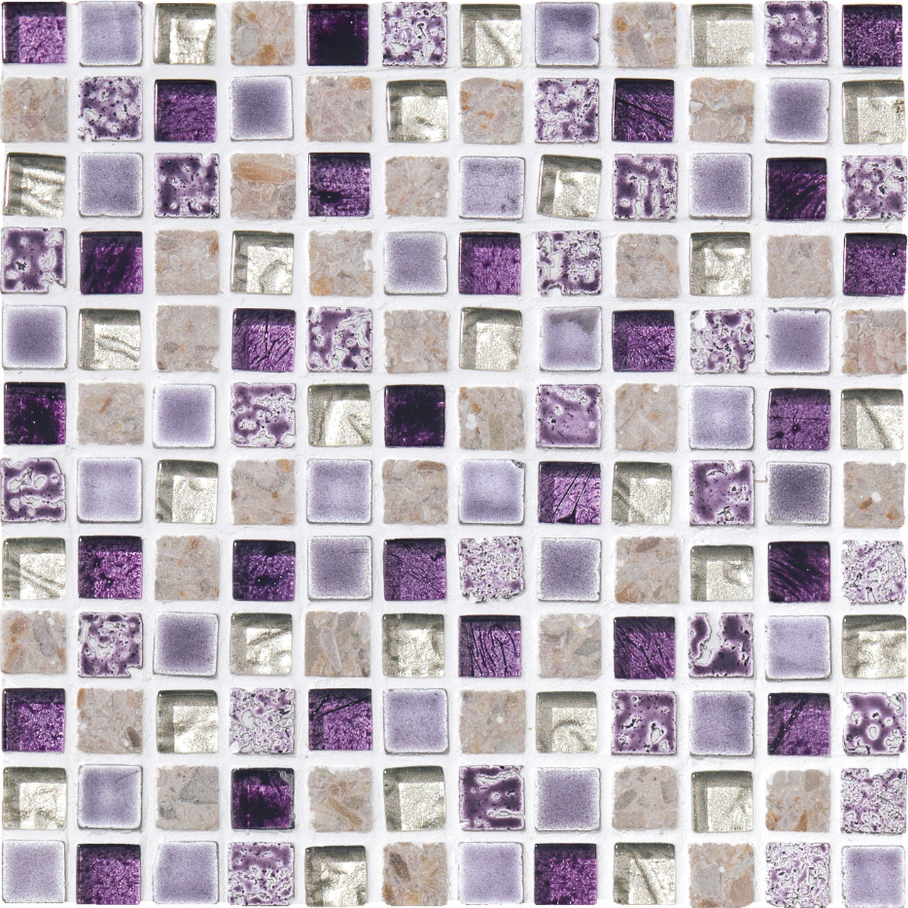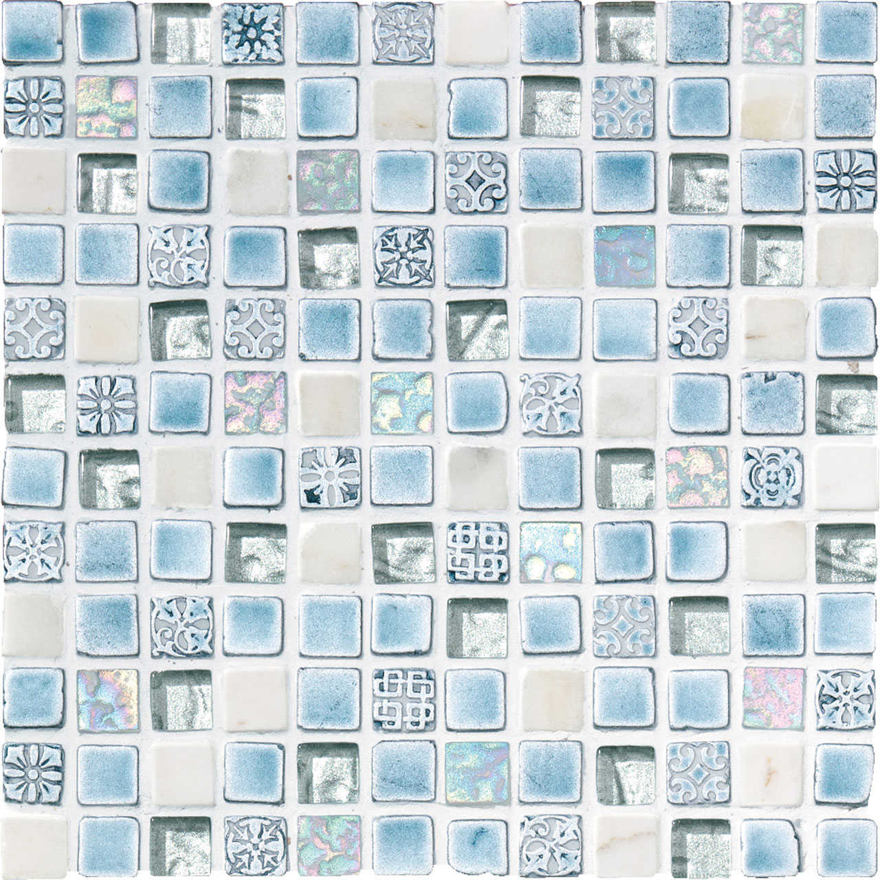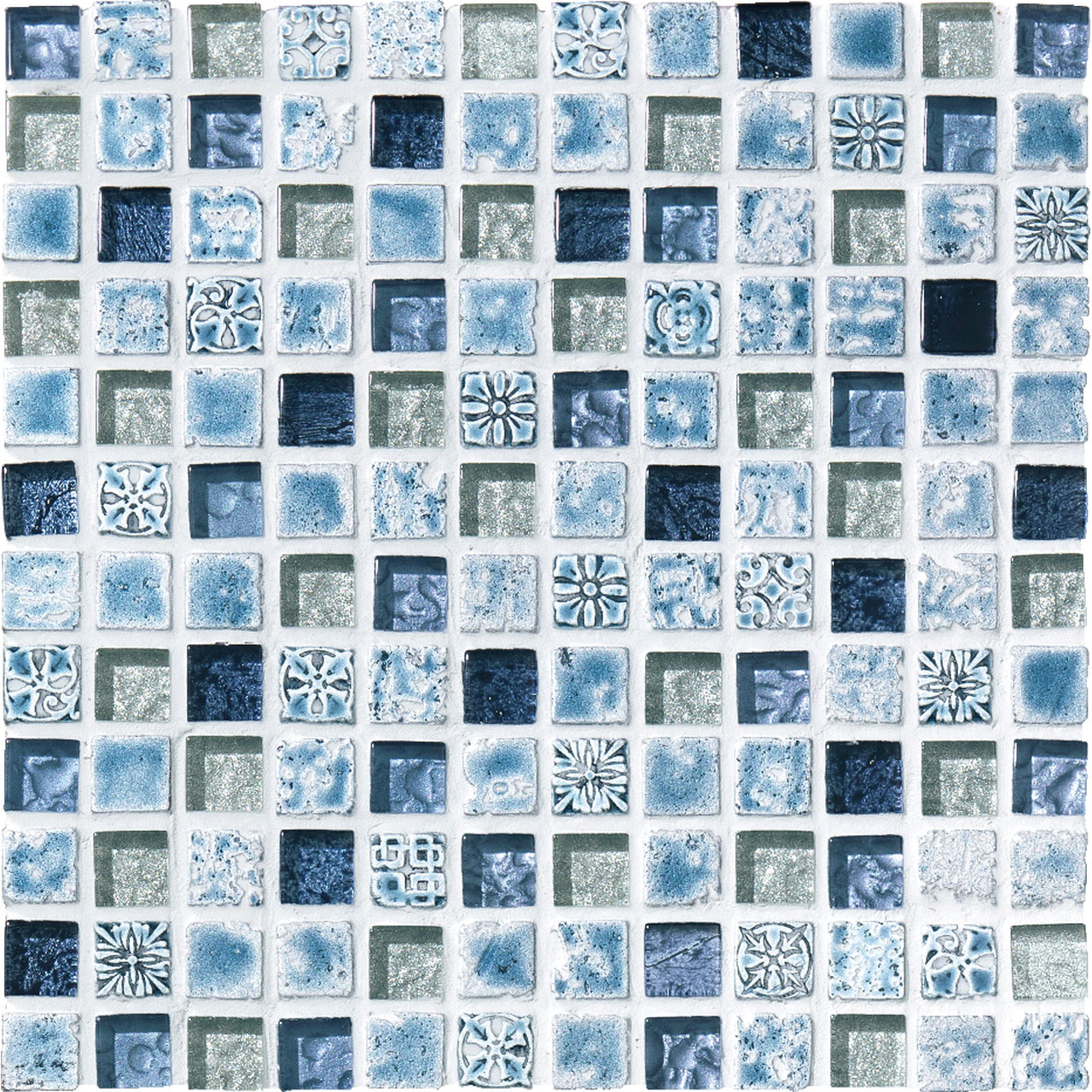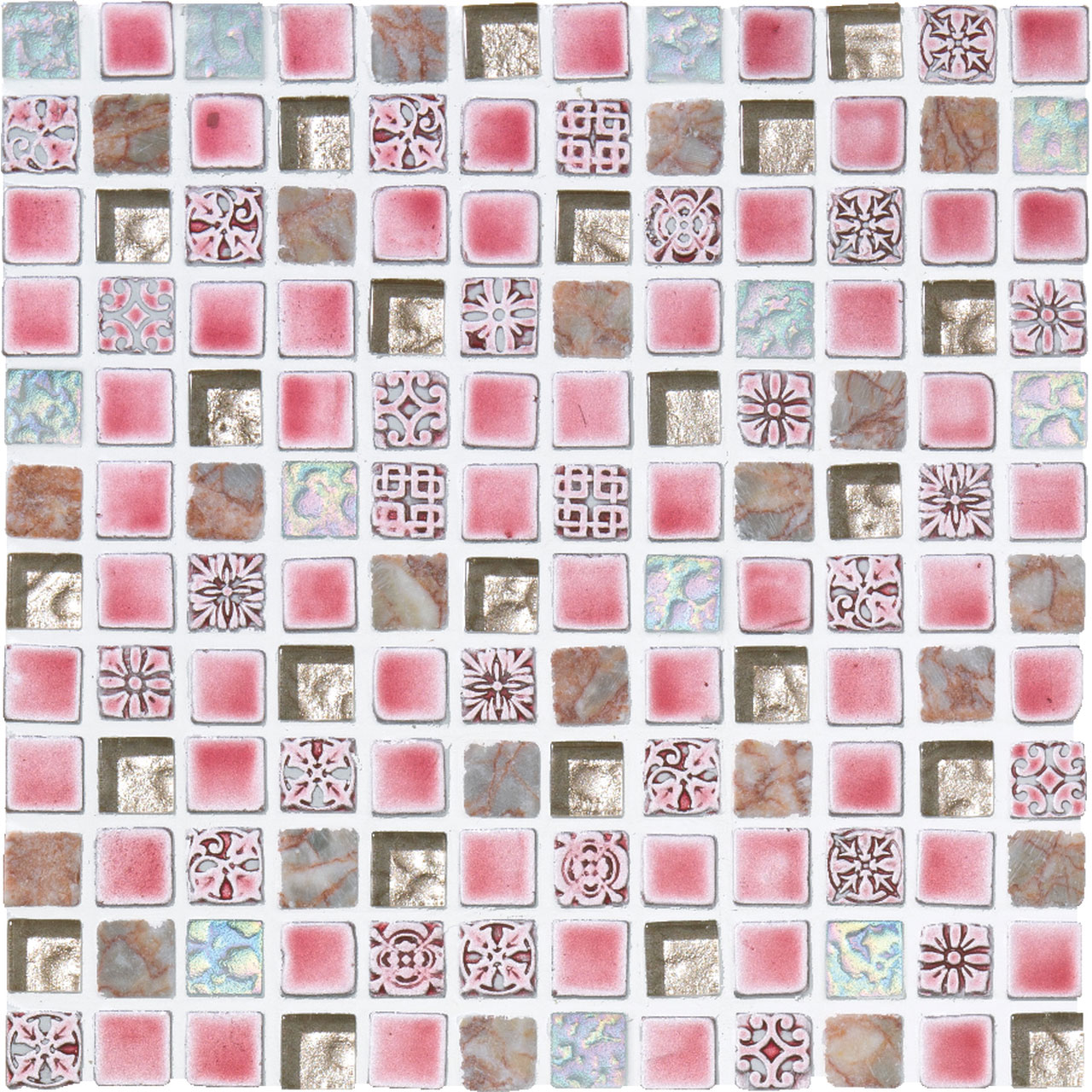 宝石をミックスして敷き並べたパヴェジュエルのようなモザイク。大理石やガラス、磁器などの多素材が混ざり合った美しいタイルです。