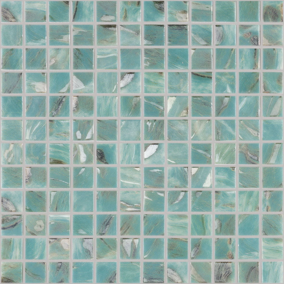 水のある空間に寄り添う色彩をイメージしデザインされたカラスモザイク。ガラス表面の特殊釉薬が、見る角度によって光沢感や色彩違いを創り出します。